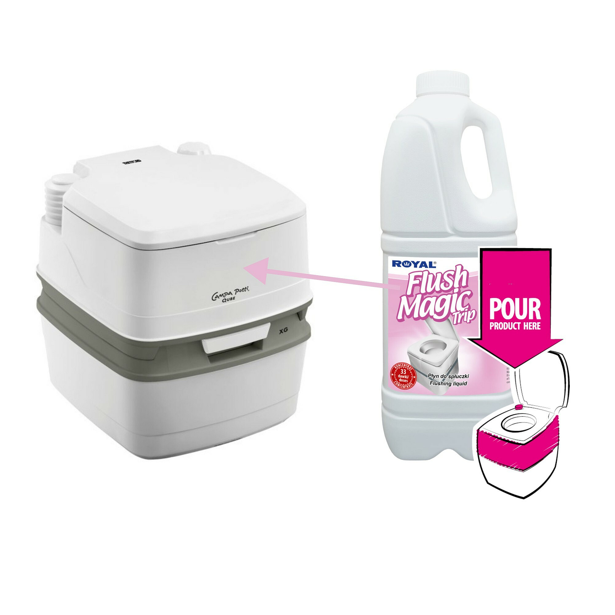 tekutina do splachovače, turistická toaleta, přenosné WC, chemické WC, koncentrát do toalety, chemie do karavanu, splachování, neutralizace zápachu, hygienická čistota, Kamai Royal, Flush Magic Trip, lesní vůně, kempování, obytný vůz, loď, zahrada, stavba, ekologický, biodegradovatelný.