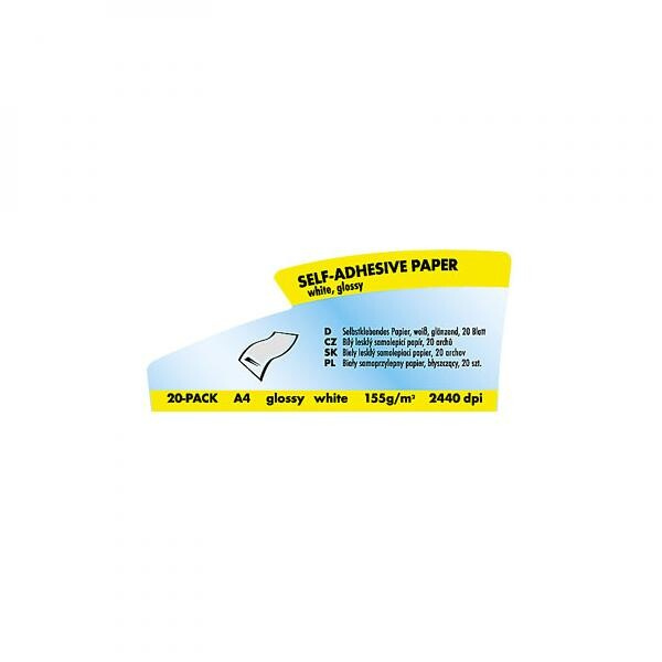 Bílý lesklý samolepicí papír je vhodný pro potisk ve všech běžných typech barevných laserových tiskáren. Lepidlo je permanentní. Svrchní papír 85 g/m2, podkladový bílý papír 55 g/m2.