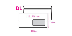 Samolepicí bílá obálka ve formátu DL s rozměrem 110x220mm pro papír A4 složený na třetiny. Kvalitní