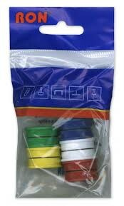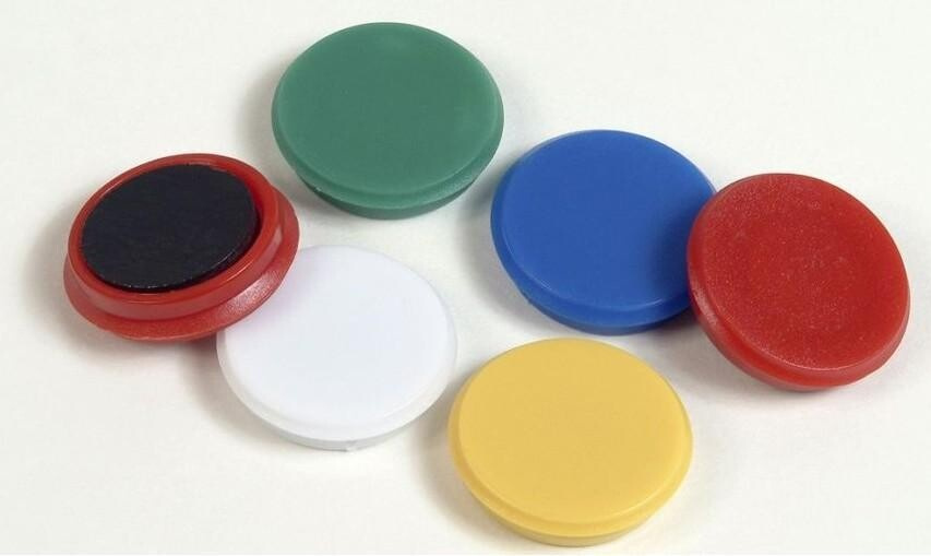 Magnety na magnetické tabule. Silný magnet je obalen barevným plastem. Praktická sada obsahuje 10 kusů magnetů.