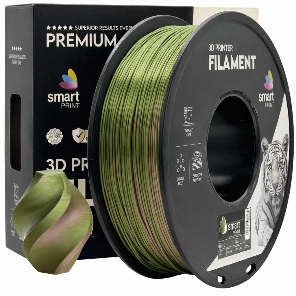 Objevte prémiový Smart Print Filament SILK PLA TRI COLOR Army 1.75mm 1kg, který posune vaše 3D tiskové projekty na novou úroveň. Tento hedvábný (SILK) PLA filament s unikátním tříbarevným efektem Army kombinuje odstíny zelené, olivové a jemně bronzové do působivého metalického vzhledu. Výsledkem jsou modely s dynamickým barevným přechodem bez nutnosti výměny filamentu během tisku.